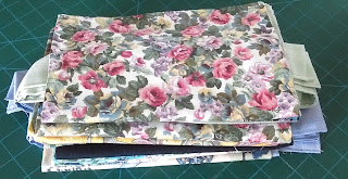 I had been given these by a friend (who knows I hate throwing out scraps!!) so after sorting through them I decide to make some 'new fabric', I have been cutting remnants of fabric from the aforementioned bags into squares intending to make a scrappy quilt for Project Linus. Some of the scraps were already triangle shapes and some appeared to be borders and were already sewn together so after a little bit of sorting I was able to chain piece them and cut them into 3 1/2" squares to add to my collection.